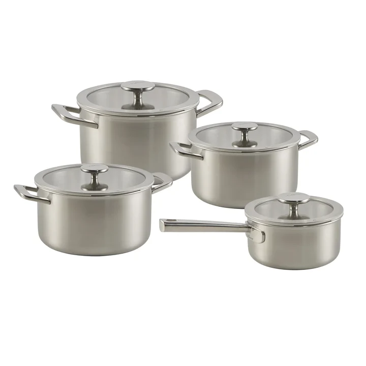 De 5 ply bodem zorgt voor een fijne balans tussen snelheid en controle: de pannen warmen vlot op en geven warmte mooi door over de hele pan. Dat merk je bij alles wat precisie vraagt, zoals sauzen, rijst of zachtjes garen. Doordat de set geschikt is voor alle warmtebronnen, kun je hem zonder nadenken gebruiken op gas, keramisch, elektrisch én inductie. Met de glazen deksels houd je ondertussen zicht op je gerecht, zonder steeds het deksel te lichten.