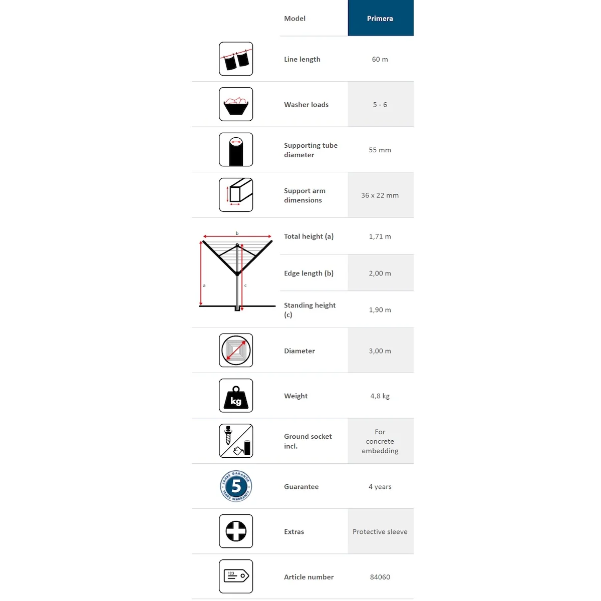 Deze droogmolen is gemaakt van een hoogwaardige "made in Germany" constructie. De droogmolen heeft een maximale stabiliteit en betrouwbaarheid in combinatie met veel comfort. Dit zijn de stelregels die leidend zijn bij de voortdurende ontwikkeling en productie van de Primera Servo. U profiteert van een buitengewone, bijna onverwoestbare droogmolen die gemakkelijk te openenen is met één hand. De stabiele 55 mm standpijp, de stabiele dubbele kokerprofielen en de hoogwaardige, gevlochten waslijn (ca. 60 m) onderscheiden de Primera SERVO.