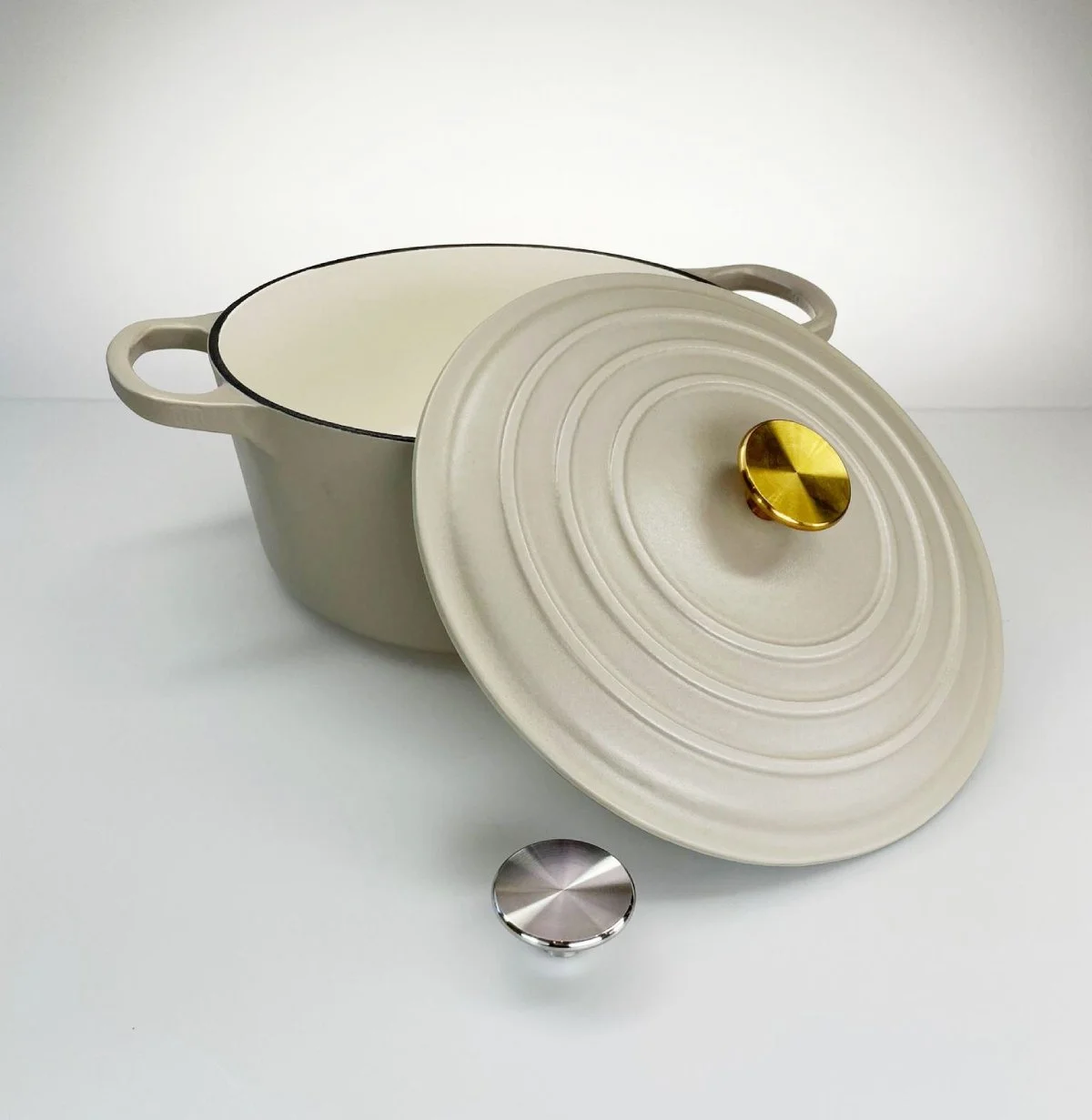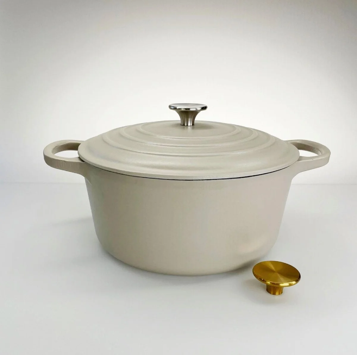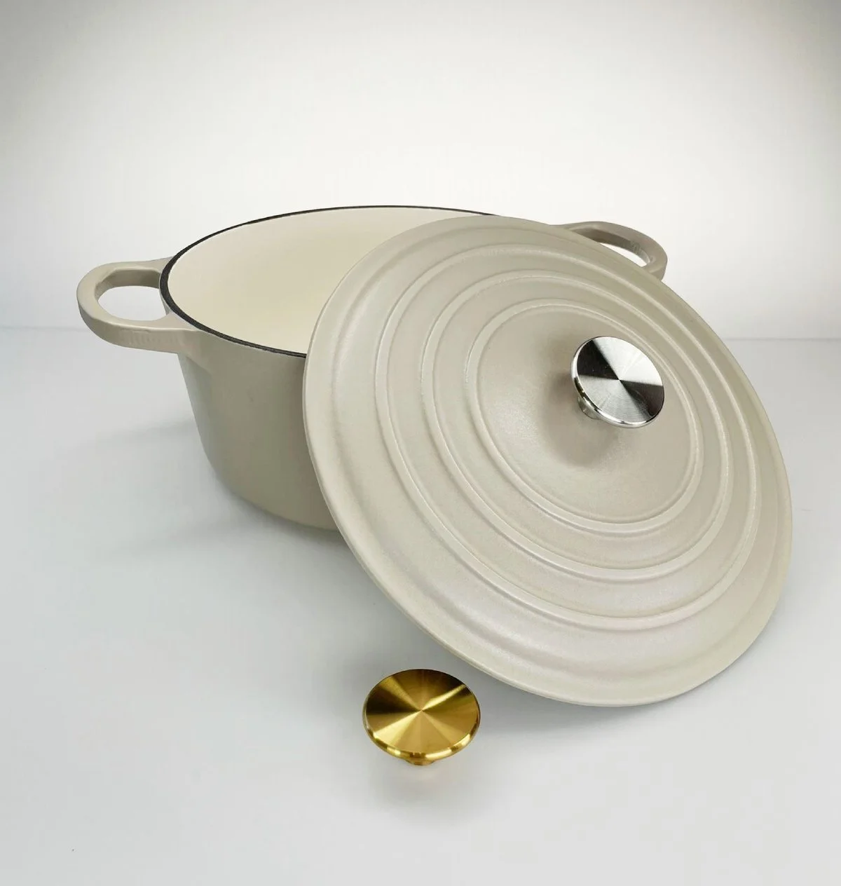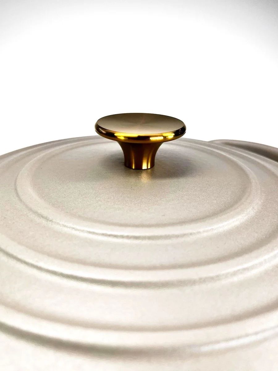 De pan is geschikt voor alle warmtebronnen, ook inductie. De onderzijde heeft glans emaille, waardoor je geen krassen op je inductiekookplaat maakt. Het gietijzeren deksel heeft een bedruppelsysteem dat vocht opvangt en gelijkmatig terug laat vallen, zodat je gerecht sappig blijft. Je krijgt twee knoppen meegeleverd, goud en RVS, zodat je zelf kiest wat je mooi vindt. Daarnaast kan de braadpan in de oven tot 260°C.