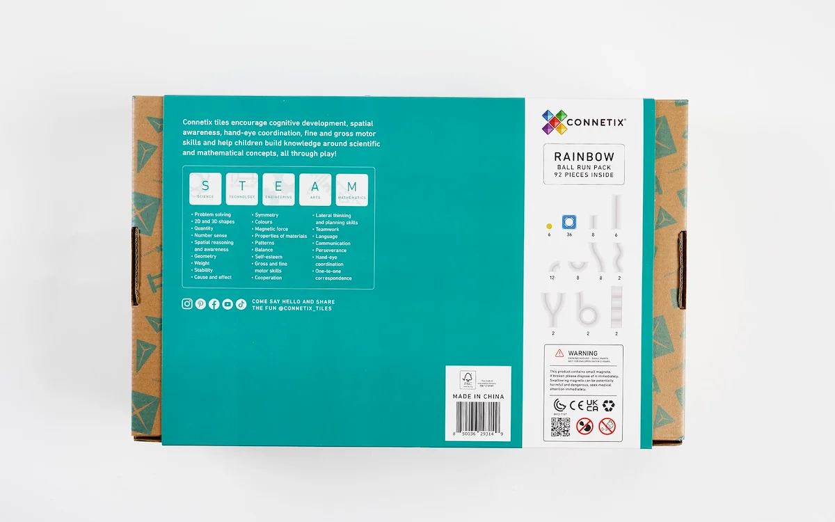 De CONNETIX Rainbow Ball Run Pack met 92 delen biedt eindeloos speelplezier en leerzame momenten voor jong en oud. Met kleurrijke tegels, doorzichtige buizen, houten ballen en spannende bochten en hellingen bouw je steeds weer een nieuwe baan. Kinderen ontdekken spelenderwijs hoe zwaartekracht, beweging, kracht en evenwicht werken. Zo leren ze meer over wetenschap en techniek, terwijl ze hun fantasie gebruiken om creatieve constructies te maken. Doordat CONNETIX een open einde speelgoed is, bepalen kinderen zelf hoe ze spelen en groeit het mee met hun ontwikkeling.
