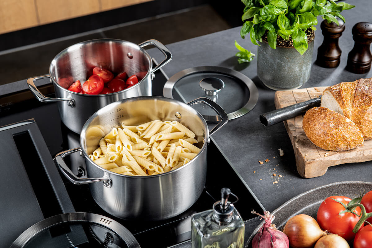 Deze set is ook ideaal voor een kookplaat met afzuiging. De deksels hebben een opening, waardoor stoom en lucht beter worden afgevoerd en de afzuiging efficiënter werkt. Daarnaast kun je via die opening eenvoudig afgieten, zonder gedoe met een losse zeef. De omgevouwen rand voorkomt scherpe randen en helpt druppen bij het uitschenken te verminderen, zodat je kookplaat schoner blijft. Na het koken is opruimen makkelijk, want de pannenset is vaatwasser bestendig. Zo combineer je gemak, veiligheid en kwaliteit in één complete set.