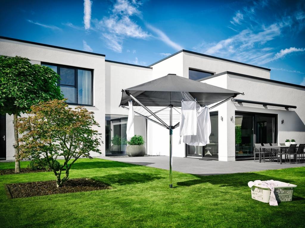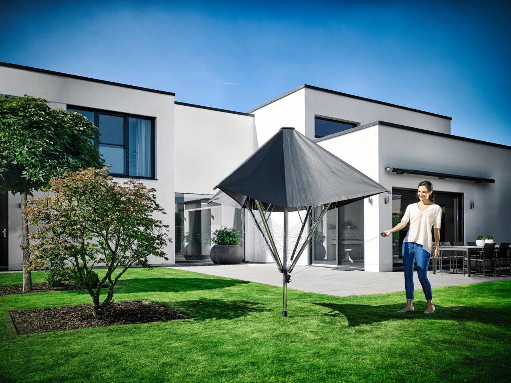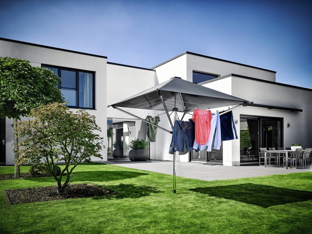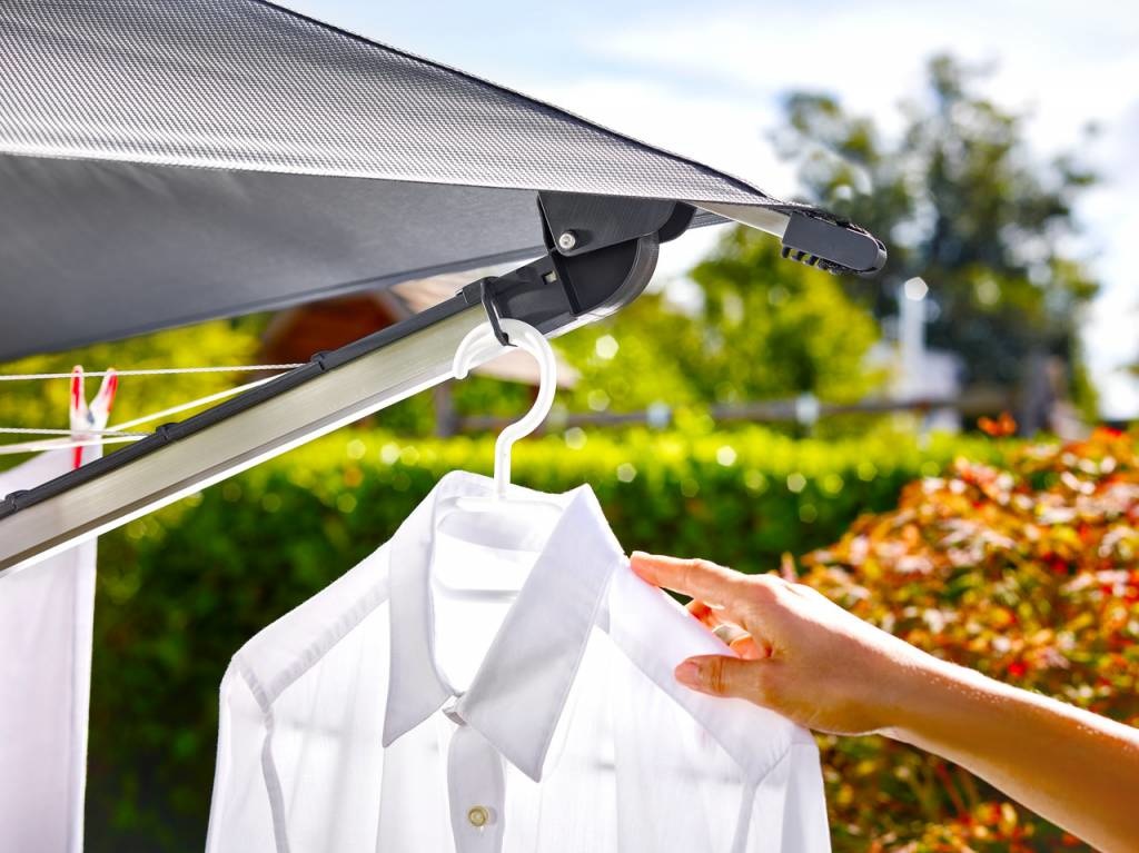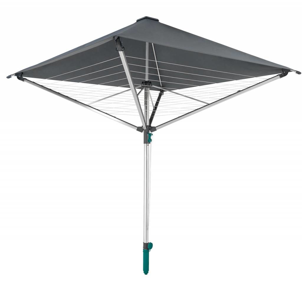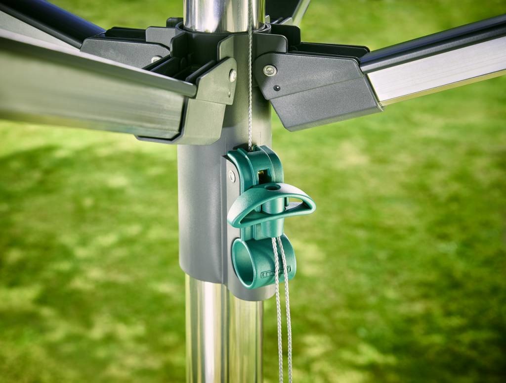 De Linoprotect 400 is voorzien van een regen en zonnescherm die je kleding tegen UV-straling beschermt en tegen de regenbuien. Met het touw aan de draagarm open en sluit je de molen eenvoudig zonder te bukken. Aan de haken op iedere draagarm kun je kledinghangers hangen om zo je was te drogen zonder knijper afdrukken. Met de bijgeleverde bodemhuls plaats je de droogmolen direct in de grond en staat deze zeer stabiel. De droogmolen kun je het gehele jaar buiten laten staan dankzij de hoogwaardige materialen, het scherm en de speciale lift-off bescherming. Deze voorkomt namelijk dat je droogmolen ervandoor gaat bij een opkomende windvlaag (maximaal windkracht 6). De hoogte van deze droogmolen is 172 cm en de totale hoogte inclusief regen en zonnescherm is 230 cm. De droogmolen wordt geleverd inclusief bodemhuls voor het vastzetten in beton.