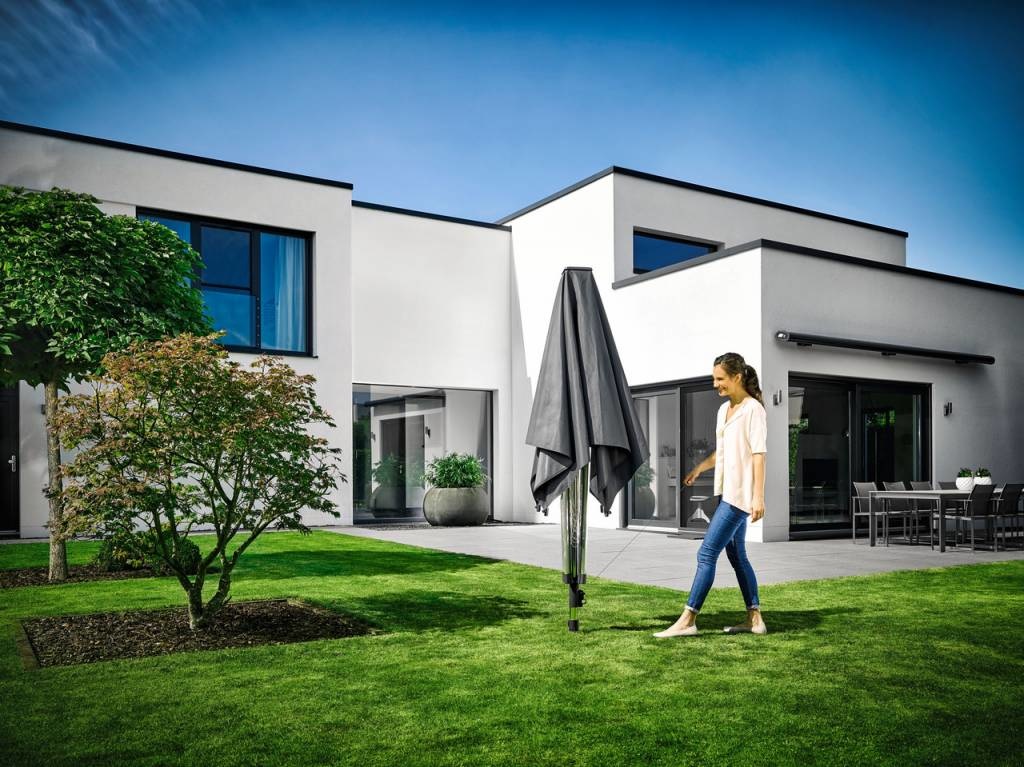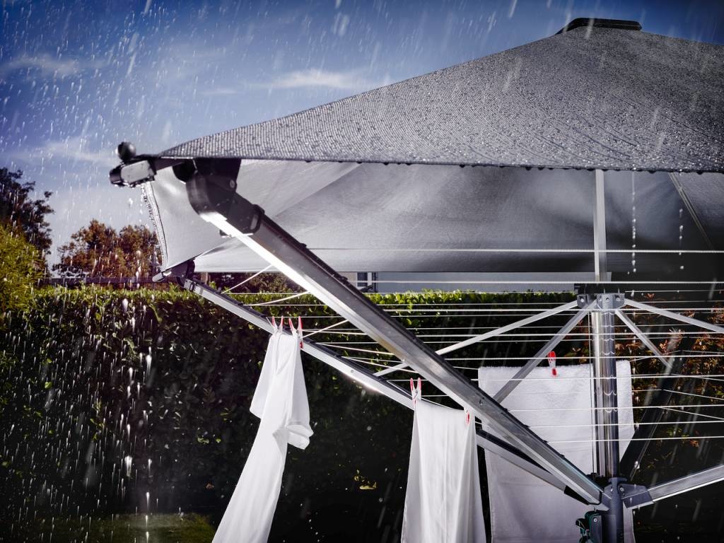 - De parasol is waterbestendig, beschermt ook tegen regen van de zijkant