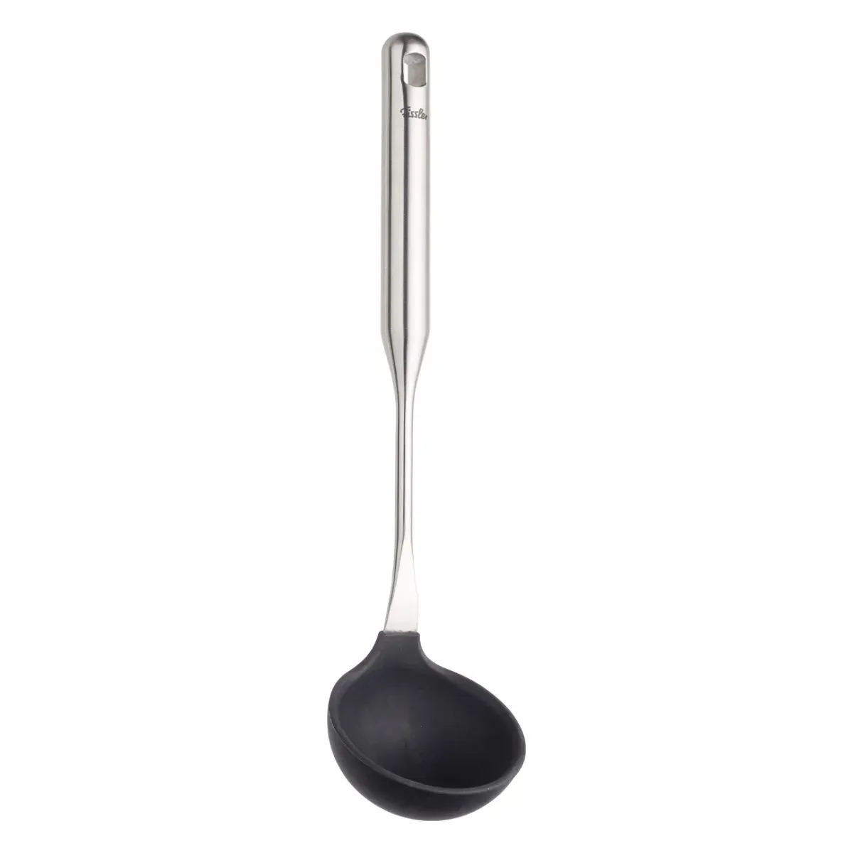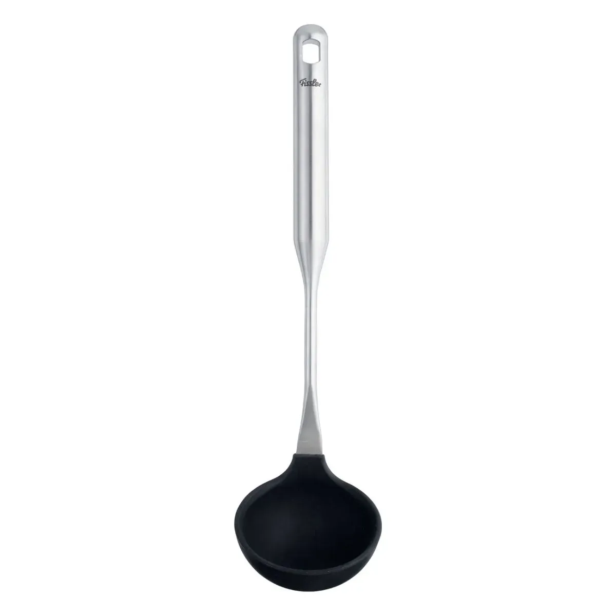 De Fissler Essential Soeplepel met siliconen is gemaakt voor voorzichtig scheppen en netjes serveren. De zachte siliconen rand is geschikt voor elke pan en beschermt vooral pannen met een antiaanbaklaag. De afgeronde lepelvorm volgt soepel de rand van de pan en schenkt soepen en sauzen zonder te morsen. Zo werk je met controle aan het fornuis en presenteer je netjes aan tafel.