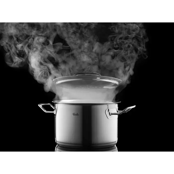 Een van de opvallende kenmerken van de pannen van de Original Profi Collection is de deksel. Die is namelijk wat “ingedeukt”, waardoor hij een klein beetje terug in de pan valt. Bovendien is de deksel extra zwaar, en sluit hij de pan goed af. Al deze features dienen hetzelfde doel: de condens valt terug in de pan. Hierdoor worden de gerechten die je erin klaarmaakt extra sappig. Dit wordt door Fissler het condens-plus-systeem genoemd. Om het condensatieproces nog wat te versnellen, leg je op de platte deksel ijsblokjes tijdens het koken.