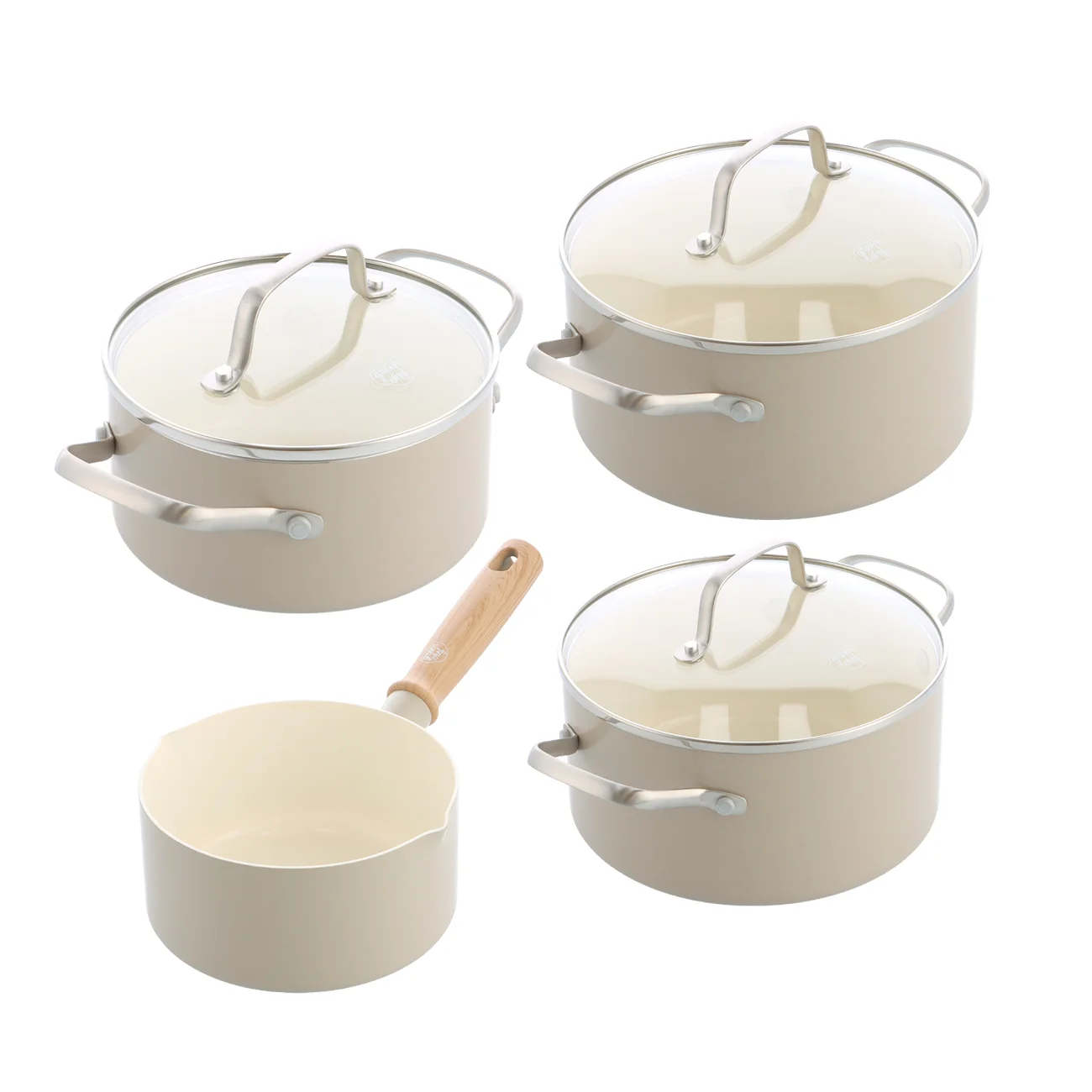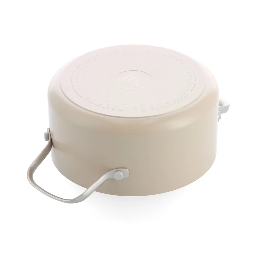 De Greenchef Nordics pannenset combineert Scandinavisch design met praktische functionaliteit. Deze stijlvolle set, uitgevoerd in een prachtige crèmekleur, bestaat uit vier veelzijdige pannen: een 16 cm steelpan, een 16 cm kookpan met glazen deksel, een 18 cm kookpan met glazen deksel en een 20 cm kookpan met glazen deksel. Dankzij de royale inhoud van de kookpannen en de PFAS-vrije keramische antiaanbaklaag is koken gezond, eenvoudig en duurzaam. De antiaanbaklaag, versterkt met diamant, voorkomt aanbranden en maakt schoonmaken een fluitje van een cent.