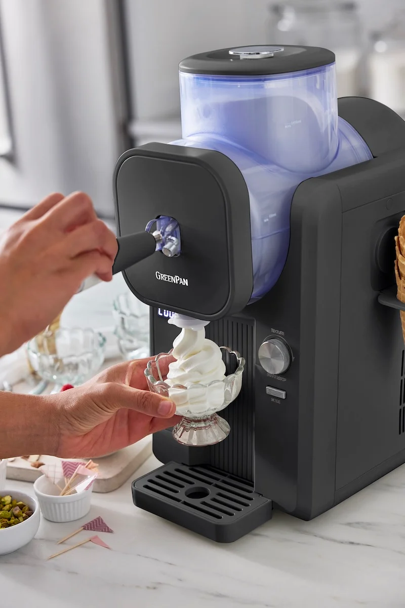 Deze ijsmachine heeft een ruime familiecapaciteit van ongeveer 1,9 liter, goed voor tot acht drankjes of tien hoorntjes tegelijk. Het led scherm maakt wisselen tussen instellingen eenvoudig. Na het maken is opruimen zo gedaan. Verwijderbare onderdelen kunnen in de vaatwasser en de schoonmaakstand helpt bij het laatste restje. In de doos vind je een siliconen schoonmaakborstel, een installatie staaf en een uitneembare mengkom. Zin in romige milkshakes, frisse sorbet, gezonde eiwit smoothies, een cola slushy of een feestelijke frozé. Met de GreenPan Ice Cream Maker lukt het allemaal, wanneer jij wilt.