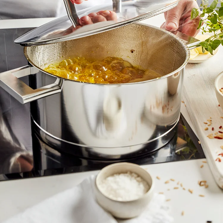 Het dubbelwandig deksel sluit optimaal aan en heeft een extra isolerend effect. Zo verlies je geen warmte en kook je met weinig vocht voor een heerlijk resultaat in minder tijd. De handige gietrand voorkomt morsen. De gegoten, gelaste roestvrijstalen grepen liggen stevig in de hand en blijven hygiënisch. De Silvinox technologie voorkomt verkleuring en houdt de glans mooi, zodat je de pan na gebruik moeiteloos schoon krijgt. Geschikt voor alle kookplaten en voor de oven. Na het koken kan alles in de vaatwasser. Ontwikkeld en vervaardigd in België en voorzien van 30 jaar garantie op productiefouten bij huishoudelijk gebruik. De John Pawson 7 is een duurzame meerwaarde voor je interieur en je kookplezier.
