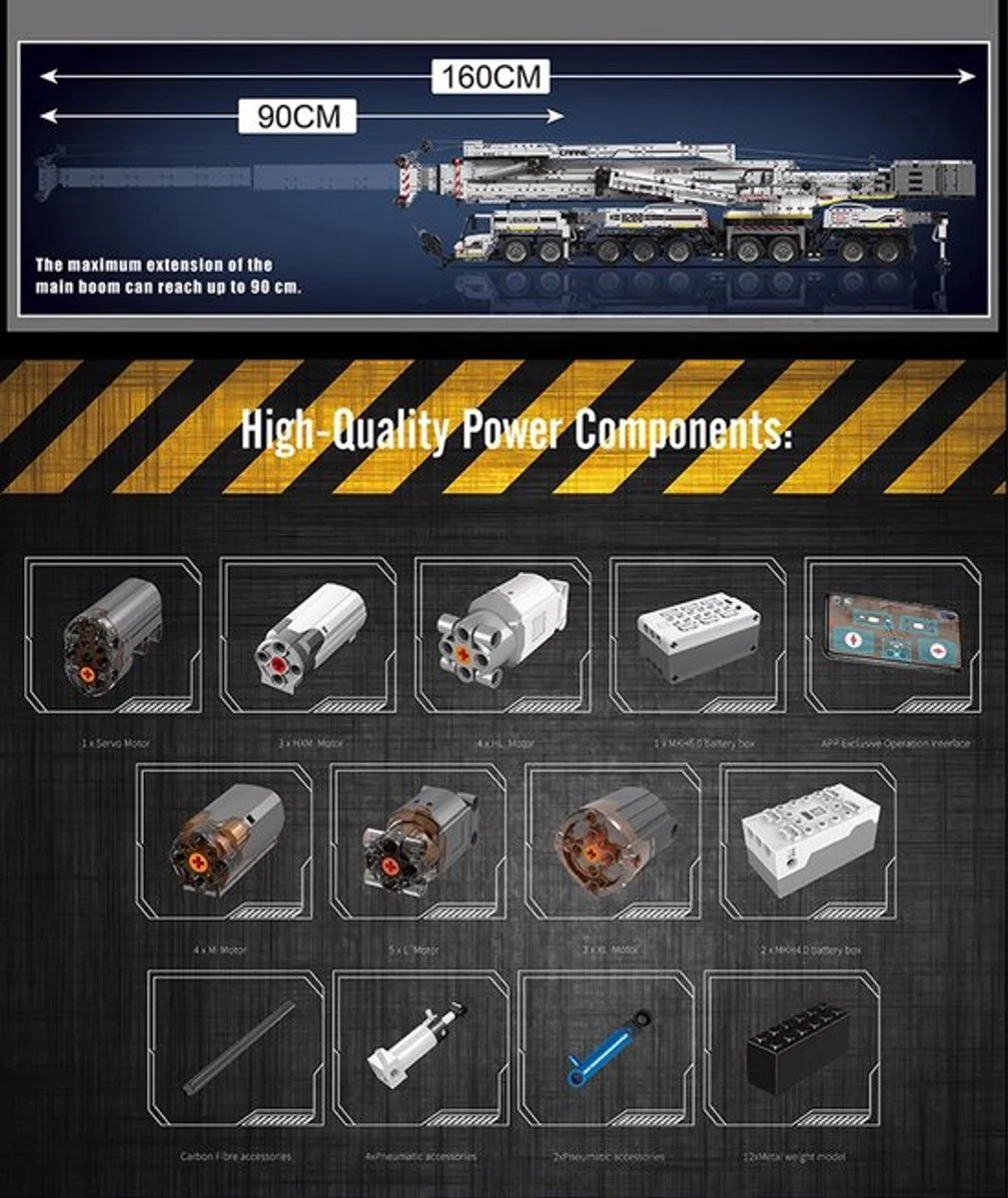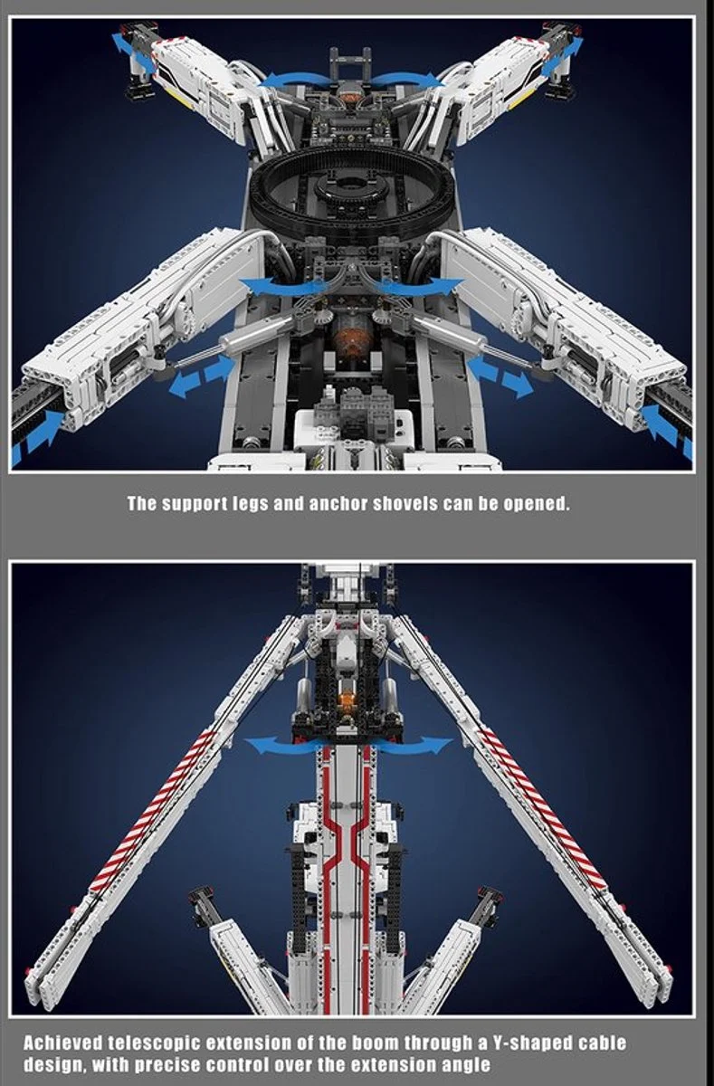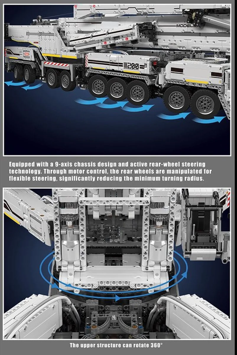 De Mould King Liebherr Kraan 8506 onderdelen is een droomproject voor elke bouwliefhebber. Dit model, geïnspireerd op de indrukwekkende Liebherr LTM 11200 kraan, wordt geleverd met afstandsbediening en biedt een bouwervaring die je niet snel vergeet. Met maar liefst 8506 onderdelen en meer dan 300 zorgvuldig gemaakte tandwielen bouw je een kraan die tot wel 160 cm hoog kan worden. Het MK CONTROL+ systeem met HALL motoren zorgt voor uiterst precieze besturing en real-time updates via de speciale app. Zo kun je de bovenwagen draaien, de giek verstellen met het touw- en katrolsysteem, het contragewicht bewegen, de haak bedienen en zelfs de cabine kantelen. Elke beweging voelt soepel en realistisch aan, alsof je een echte kraan in handen hebt. Dit is niet alleen een bouwset, maar een technisch hoogstandje dat techniek en speelplezier combineert.
