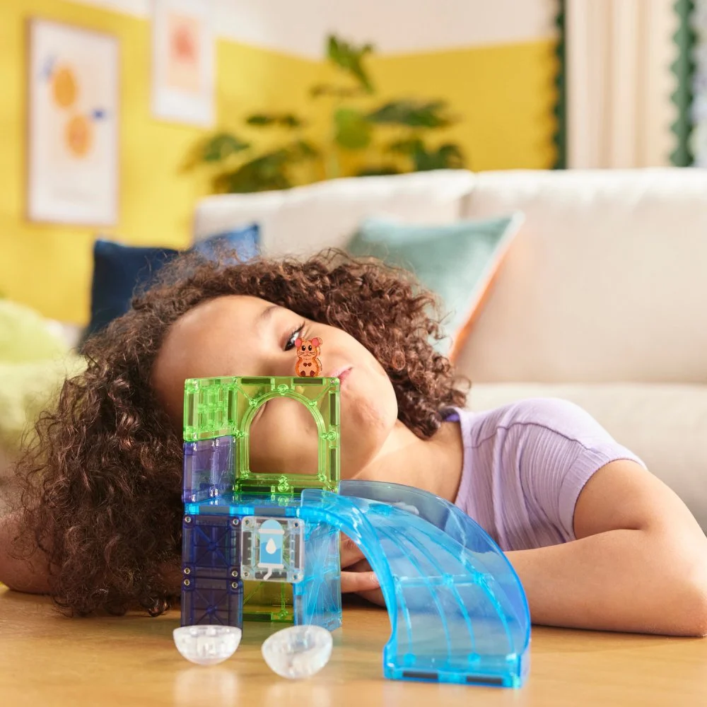 Met de Magna-Tiles Hamsterbal 13-delig gaan kinderen op avontuur met hun eigen schattige hamsterfiguurtje! Deze compacte set draait helemaal om beweging, fantasie en bouwen. De kleurrijke magnetische tegels vormen samen een speelomgeving waar de hamster kan rennen, rusten of natuurlijk een ritje maken in z’n eigen hamsterbal! Dankzij de stevige magneten klikken de onderdelen makkelijk aan elkaar, en kunnen kinderen eindeloos bouwen, combineren en variëren. De grappige prints, interactieve elementen en het bolvormige hamsteronderdeel maken deze set een unieke toevoeging aan elke Magna-Tiles verzameling.