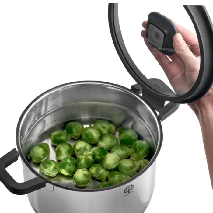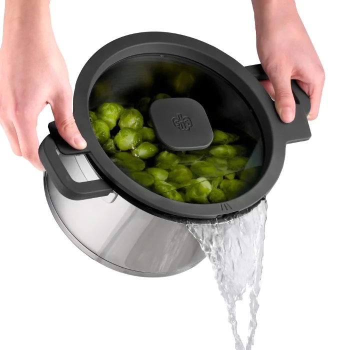 Wat deze kookpan bijzonder maakt, is het slimme en praktische ontwerp. Het platte glazen deksel is hittebestendig, breukvast en heeft een siliconen rand voor een perfecte afsluiting. Je kunt het deksel ophangen aan het handvat of zelfs gebruiken als onderzetter. Er zitten geen losse onderdelen onder het deksel, wat zorgt voor een hygiënische en eenvoudige reiniging. De dekselknop is van siliconen en blijft koel tijdens het koken. Bovendien zijn de handgrepen zo ontworpen dat het deksel er netjes op past wanneer je het even wilt neerleggen of stomen. De Max Kookpan is stapelbaar met andere pannen uit de serie, wat handig is om ruimte te besparen in je keukenkastjes. Deze pan is ook ideaal voor gebruik met kookplaten met geïntegreerde afzuiging, omdat het stoom netjes geleid wordt. Een slimme keuze voor wie comfort en kwaliteit zoekt in een compacte kookpan.