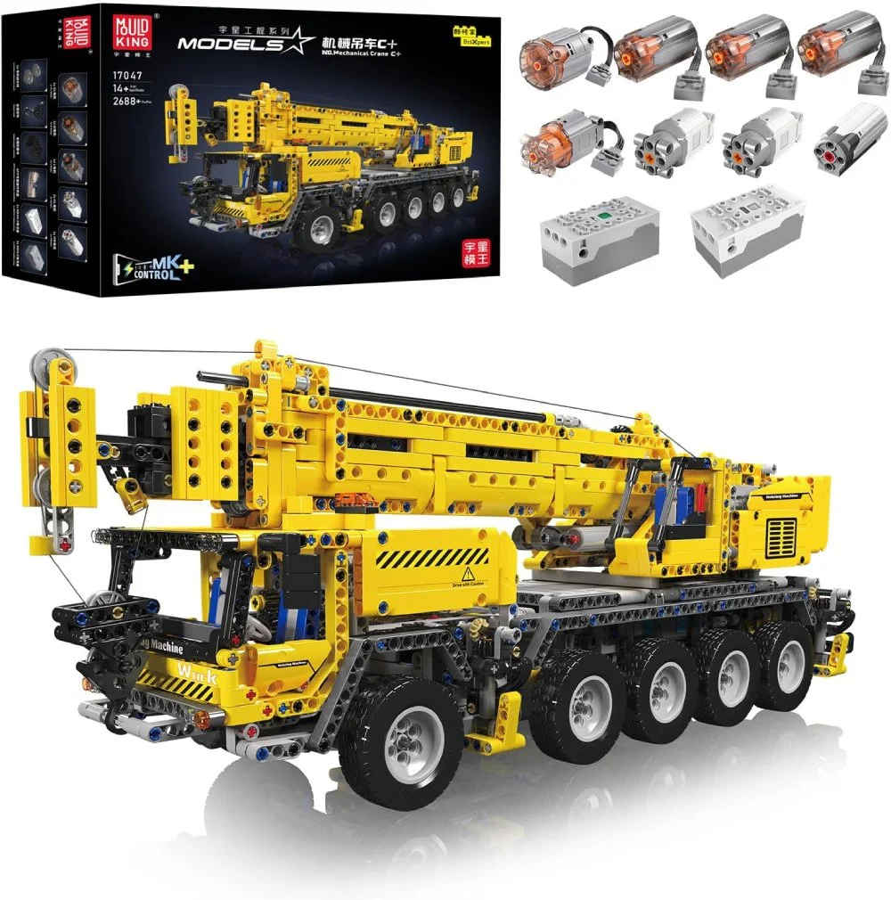 De Mould King 17047 Mechanische Kraan is een indrukwekkend bouwproject dat zowel beginners als ervaren bouwers uitdaagt. Met maar liefst 2688 onderdelen bouw je een kraan die tot 90 cm hoog reikt wanneer de giek volledig is uitgeschoven. Dit model combineert een gedetailleerd ontwerp met realistische functies, waardoor het niet alleen een prachtig bouwproject is, maar ook een technisch meesterwerk. Het hart van deze set is het MK CONTROL+ systeem met HALL-motoren, dat zorgt voor ongeëvenaarde precisie en soepele bewegingen. Je kunt de kraan volledig besturen via de meegeleverde afstandsbediening of de nieuwe app-interface, waarmee elke functie letterlijk binnen handbereik ligt. Van het draaien van de bovenwagen tot het nauwkeurig verplaatsen van de giek: elke actie voelt vloeiend en realistisch aan.