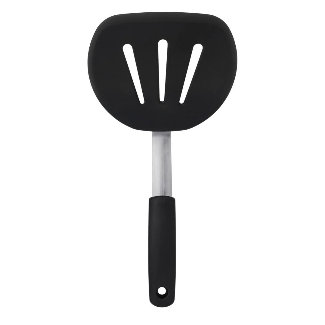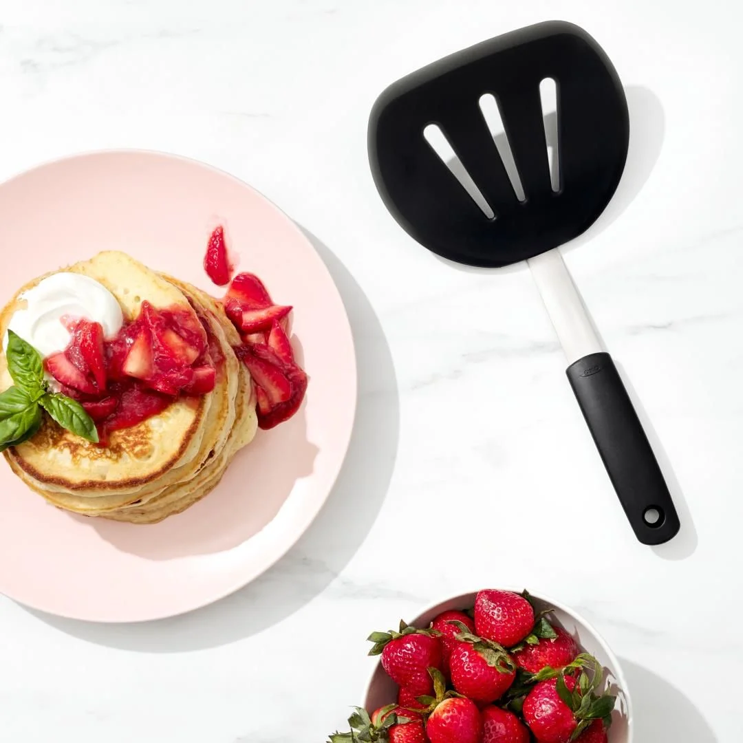 De OXO Good Grips flexibele pannenkoekspatel is een onmisbare hulp in de keuken voor het moeiteloos draaien van pannenkoeken, eieren, hamburgers en andere gerechten. Dankzij de dunne, flexibele randen glijdt de spatel gemakkelijk onder het voedsel, terwijl overtollig vet eenvoudig wegloopt via de handige gleuven. De combinatie van een stevige roestvrijstalen kern en een flexibele siliconen buitenlaag zorgt voor extra stabiliteit én een anti-kleef effect, waardoor deze spatel veilig te gebruiken is op pannen met een anti-aanbaklaag. De comfortabele anti-slip handgreep ligt stevig in de hand, zelfs als je handen nat zijn, en met het praktische ophangoog berg je hem eenvoudig op. Bovendien is de spatel hittebestendig tot 300°C en vaatwasmachinebestendig.