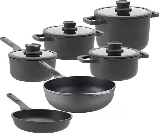 Een compleet pannenset met handige functies en een prachtig design. Dat is hoe je de BergHOFF Pannenset Leo Stone - 7 delig in één zin omschrijft. De pannen kunnen op alle warmtebronnen gebruikt worden en zijn geschikt voor het Downdraft systeem. De BergHOFF Leo Stone pannen zijn gemaakt van gegoten aluminium. Dit zorgt ervoor dat de pannen heel licht zijn en dus makkelijk te hanteren. Bovendien wordt de warmte zo gelijkmatig verdeeld zonder hete plekken. De Downdraft pannen beschikken over een hoogwaardige antikleeflaag, zodat het voedsel niet in de pannen blijft plakken. De randen zijn zo gemaakt dat je drupvrij kunt afgieten.