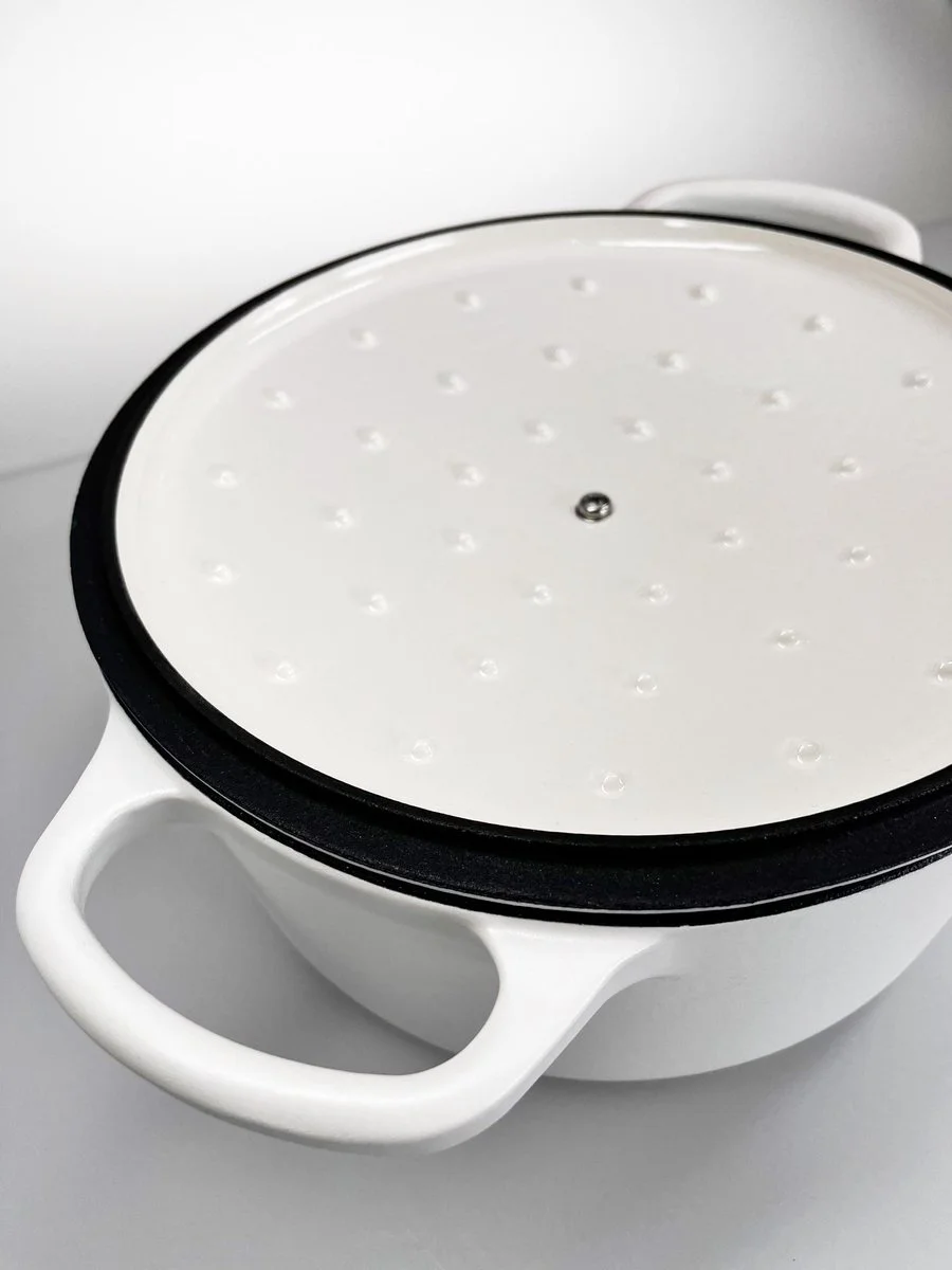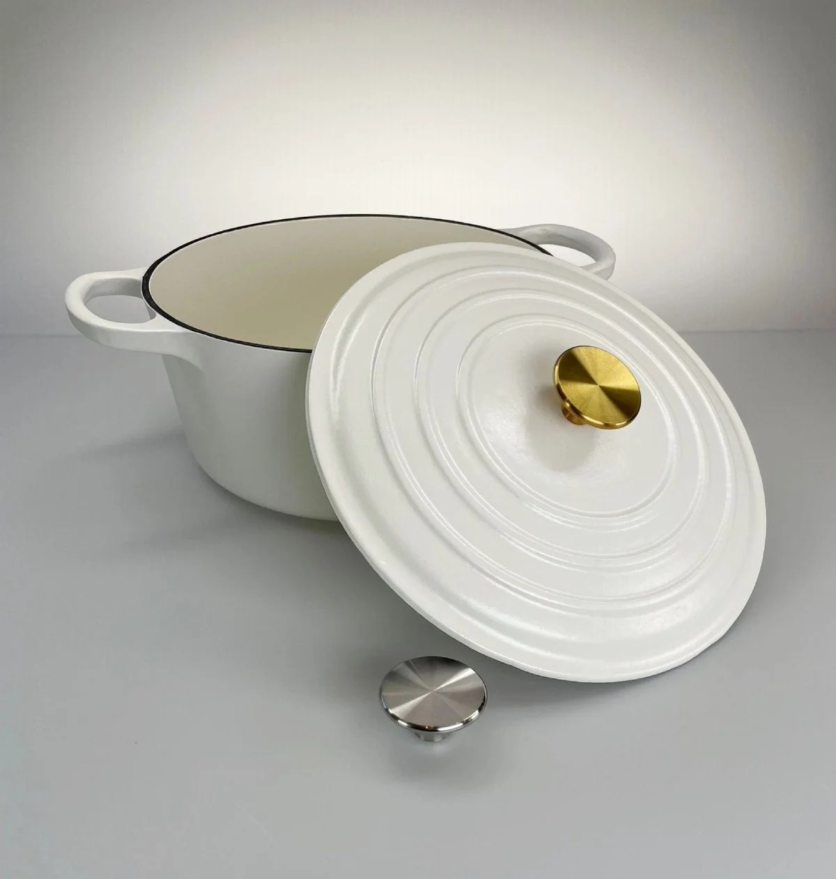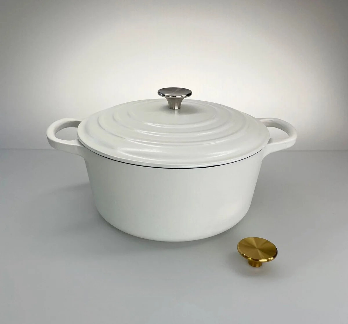 De pan is geschikt voor alle warmtebronnen, ook inductie. De onderzijde heeft glans emaille, waardoor je geen krassen op je inductiekookplaat maakt. Het gietijzeren deksel heeft een bedruppelsysteem dat vocht opvangt en gelijkmatig terug laat vallen, zodat je gerecht sappig blijft. Je krijgt twee knoppen meegeleverd, goud en RVS, zodat je zelf kiest wat je mooi vindt. Daarnaast kan de braadpan in de oven tot 260°C.