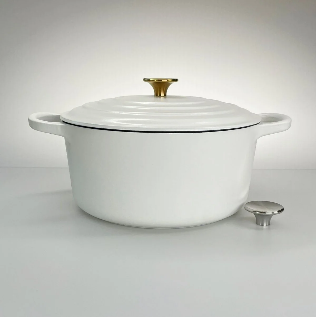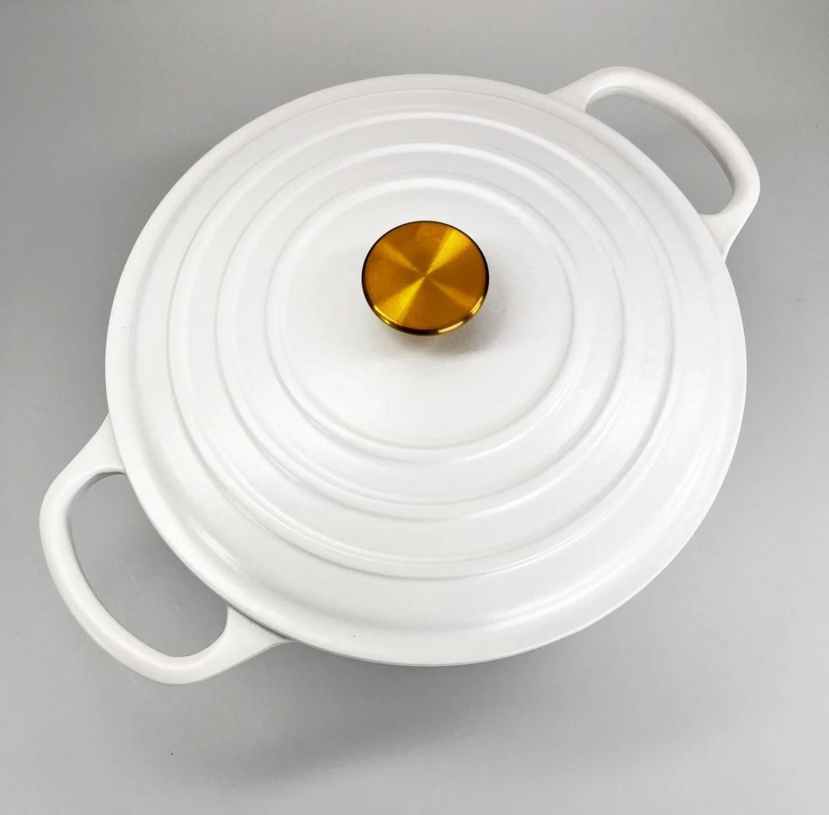 De Relance braadpan van gietijzer 26 cm in mat wit is een stevige pan voor langzaam garen met veel smaak. Met een inhoud van 4,5 liter en een hoogte van 12 cm is hij ideaal voor stoofgerechten, soepen en een mooie braadschotel voor het hele gezin. De geëmailleerde binnenzijde helpt tegen aankoeken en maakt schoonmaken een stuk makkelijker.