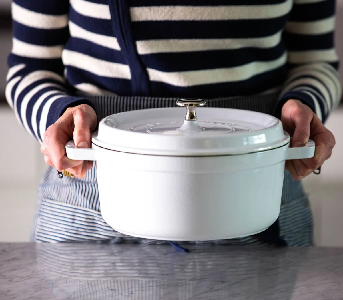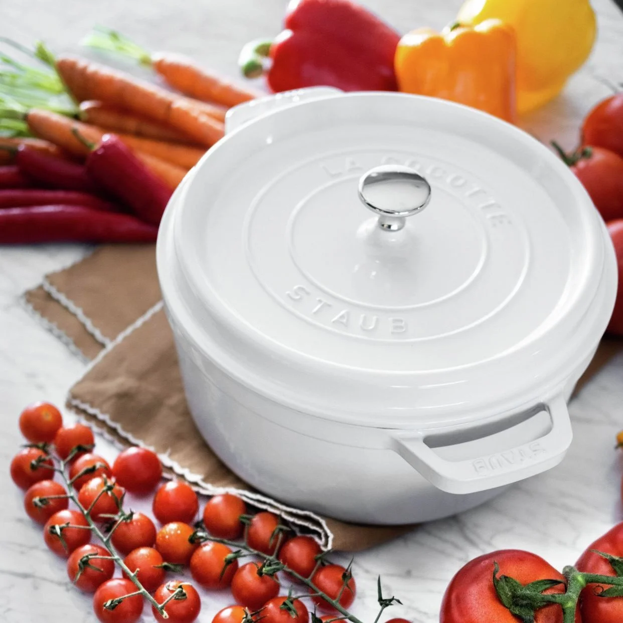 De Staub Cocotte van 26 cm in wit is een echte topper voor wie graag smaakvolle gerechten maakt. De pan is gemaakt van duurzaam geëmailleerd gietijzer, dat de warmte gelijkmatig verdeelt. Hierdoor worden je gerechten mooi egaal gaar. Aan de binnenkant zit een mat zwarte emaillelaag die zorgt voor beter aanbraden en extra diepe smaken. Het speciale deksel houdt de vochtigheid optimaal vast, zodat vlees, stoofgerechten en groenten heerlijk mals en sappig blijven tijdens het koken.
